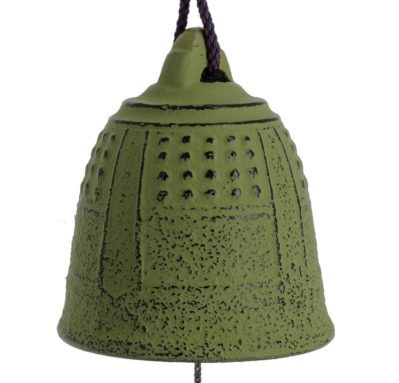 This bell, Fūrin (風 鈴 - litt. wind bell) is a cast-iron wind chime made by the Iwachu company in Morioka, Japan. It is traditionally placed on the ledges of temples or houses, and they tinkle with the wind that activates the carillon by the hanging piece of paper, the tansatsu, on which is often inscribed a Haiku or a wish. In the suffocating heat of summer, the sound of these little bells is refreshing for the Japanese. You can hang your bell inside the house next to a door or window or outside in the garden or on the terrace. According to the old system of feng shui, green is the color of nature, so it is associated with balance, growth and abundance.