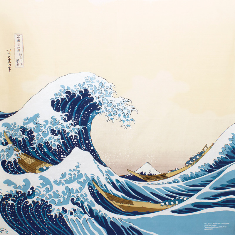 On this Furoshiki, is reproduced one of the most famous prints by Hokusai Katsushika, "Kanagawa-oki nami-ura" (神奈川沖浪裏) or "The great wave of Kanagawa" which is part of a series of prints entitled "Thirty-six views of Mount Fuji".