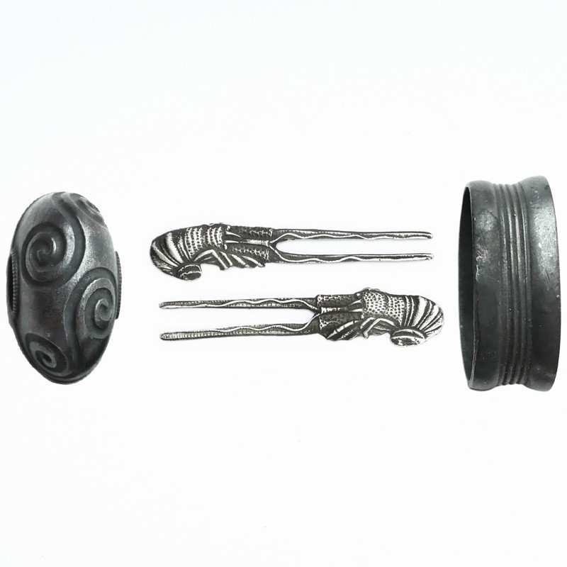 Menuki: Ebi 海老 (Shrimp/Lobster), made of iron. Shrimp/lobster is a symbol of longevity and vigor. Kanji can read "Old Man of the Sea".