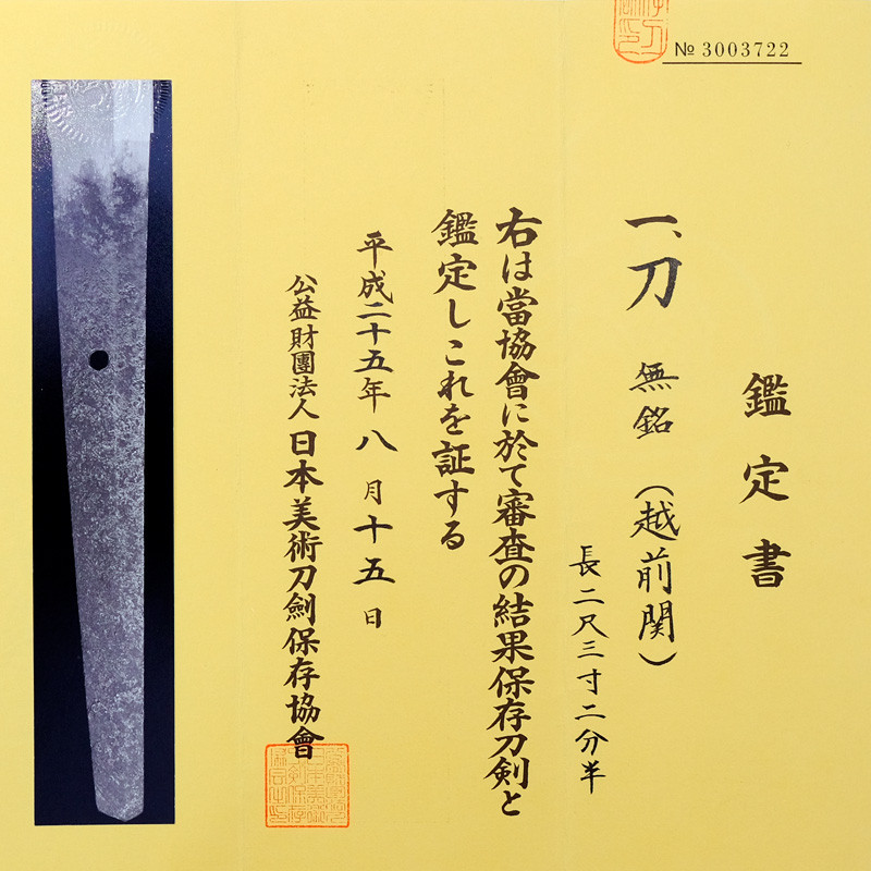 Echizen Seki 越前関 is a school of Seki blacksmiths in the former province of Mino (Gifu) who settled in Echizen (Fukui) during the Keicho era (1596-1615). |