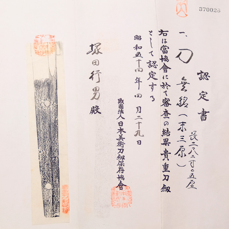 | Nakago | O Suri Age (strongly shortened) 2 Mekugi Ana, Kiri Yasurime, Classic shape Futsu Gata, Kiri Nakago Jiri | |