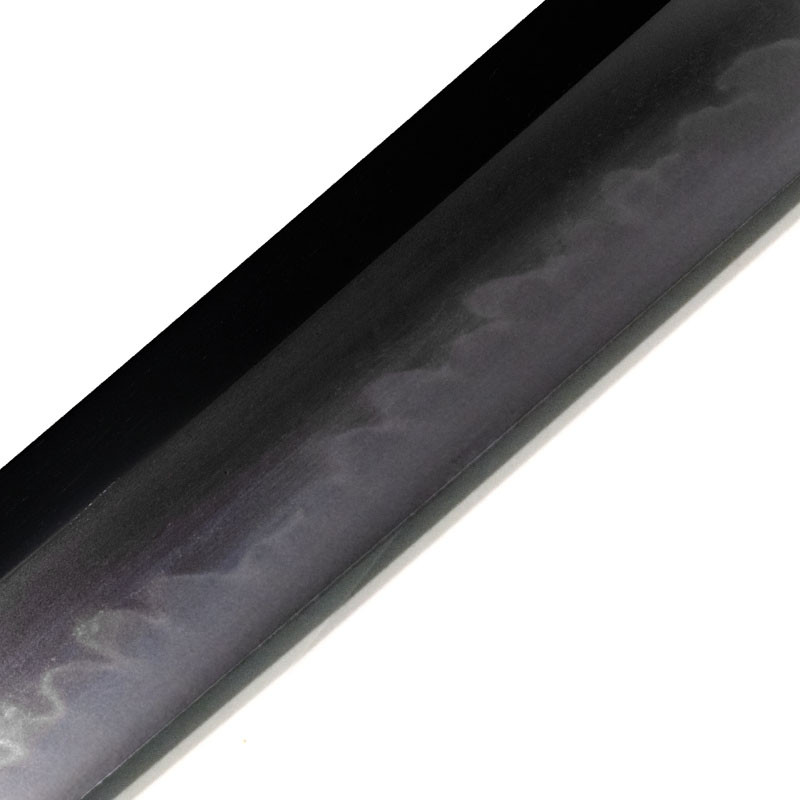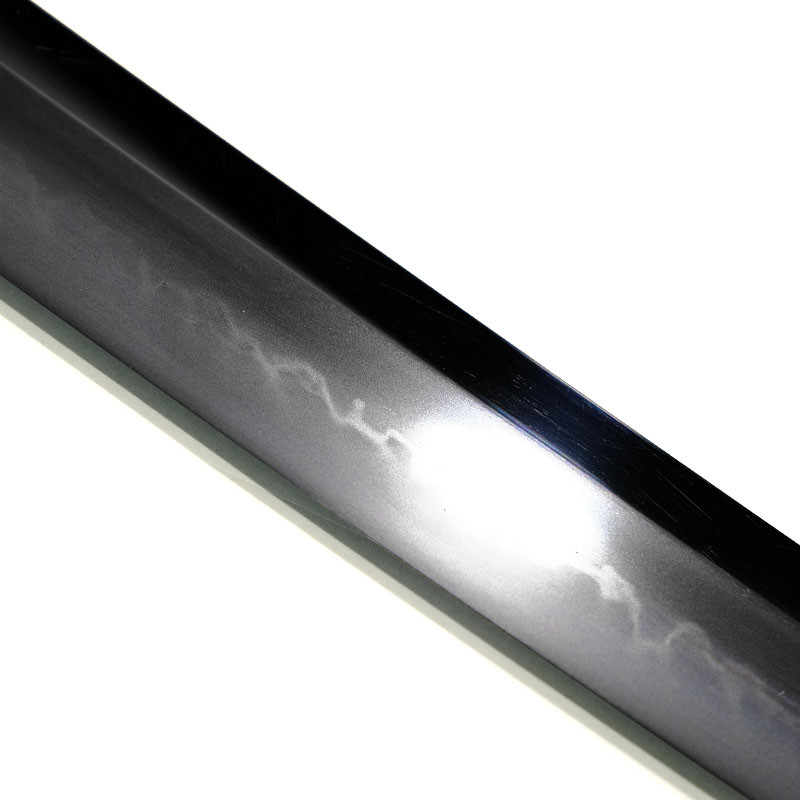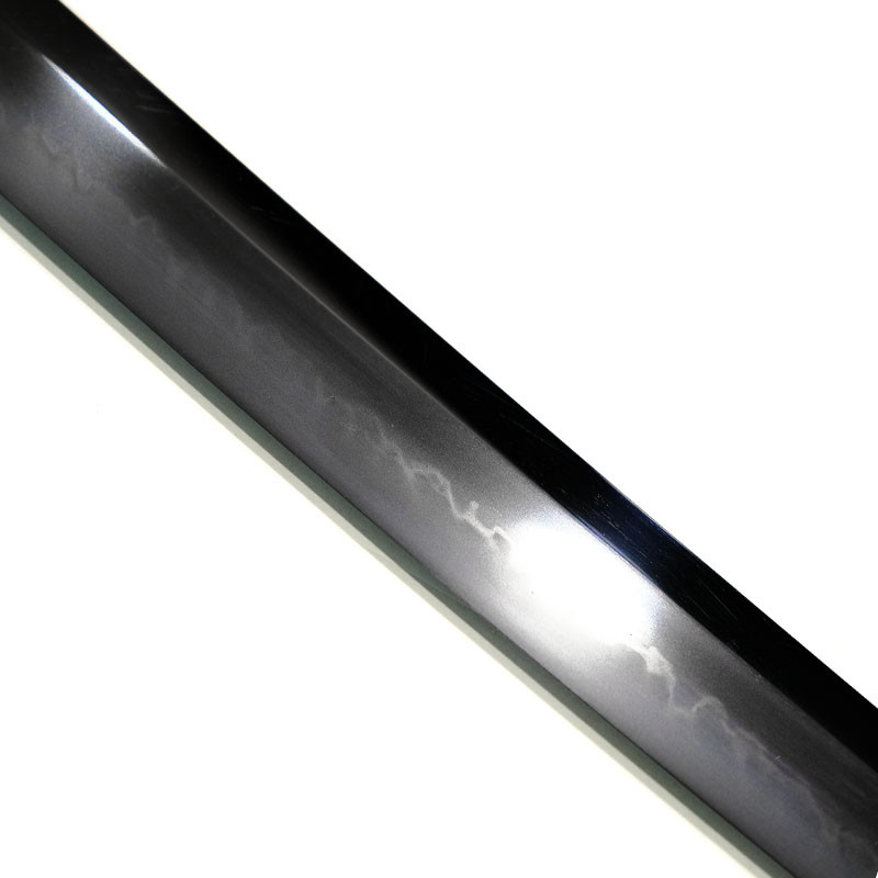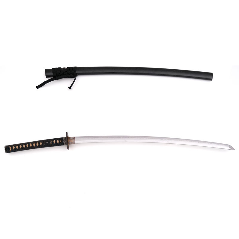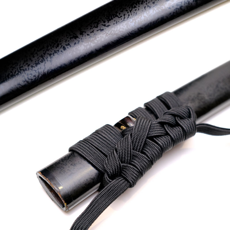 Length 74cm, weight 240g, Black lacquer Kawari nuri type with alternating matte and glossy, Silk black Sageo, golden Shitodome, reinforced Kojiri and Koiguchi. |