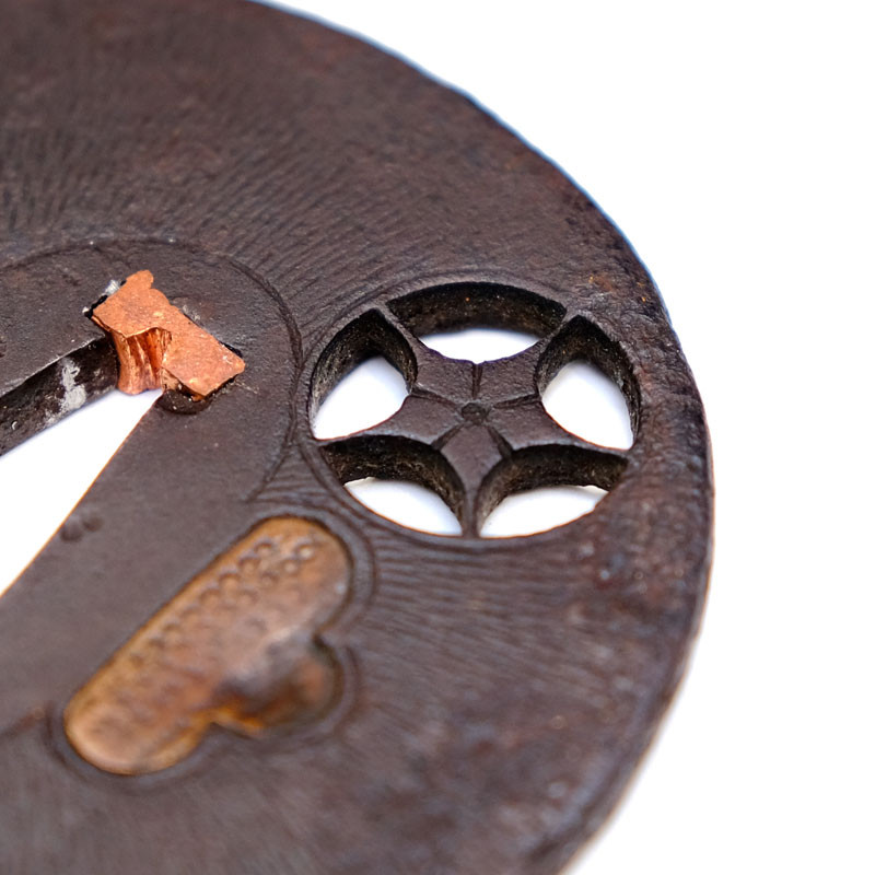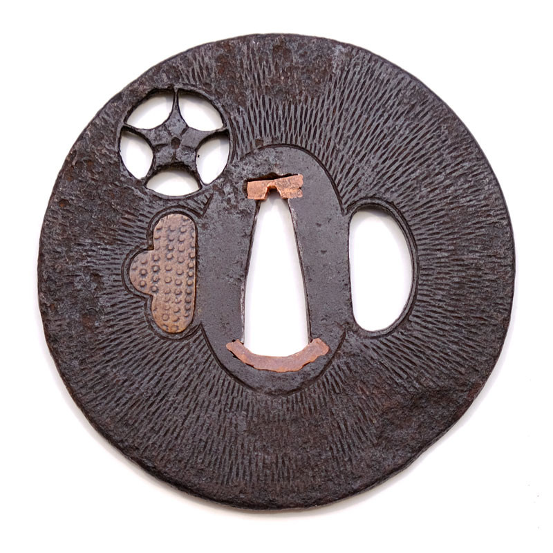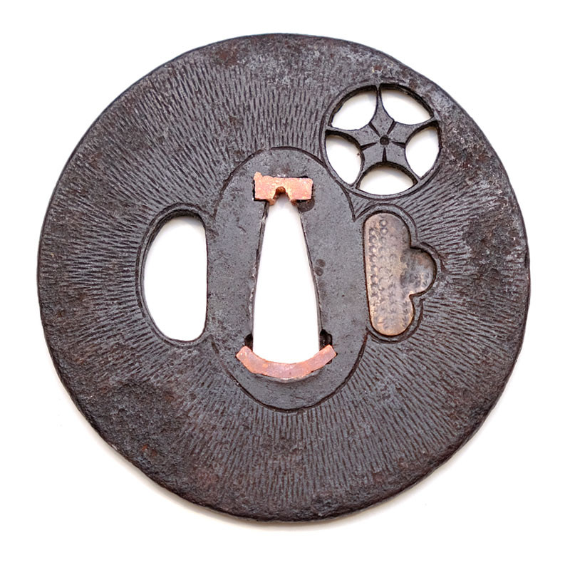 - Tsuba: Weight 115g, dimensions 7.45 x 7.45 x 0.45cm, round shape Maru Gata, right edge Kaku Mimi, Presence Kozuka Ana and Kogai Ana (Kogai Ana obturated by Histu Ume), surfacing with ray patterns, work in Sukashi opening with snowflake pattern or flower Kikyo type.