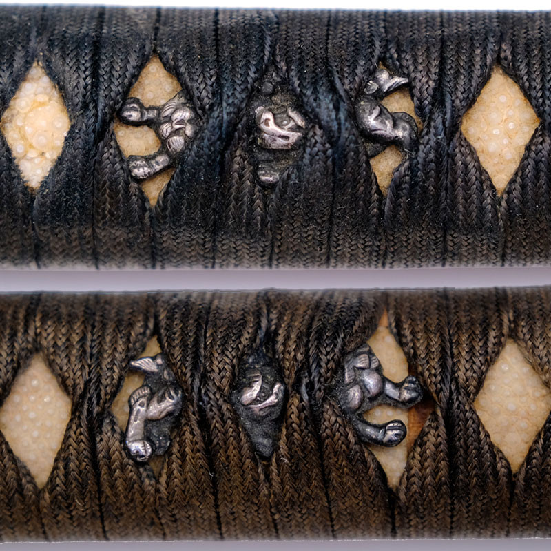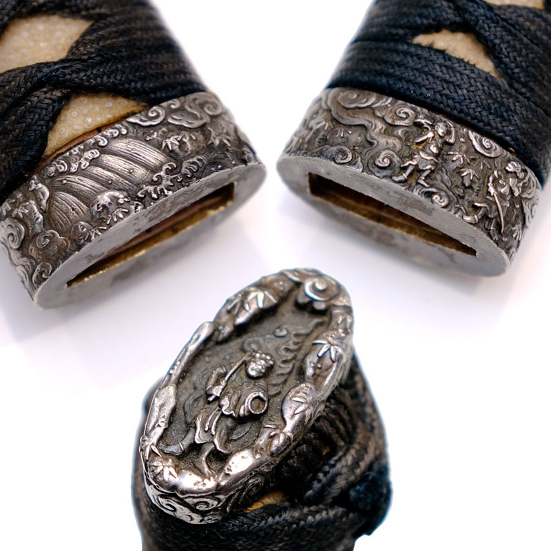 - Tsuka: length 26.3cm, weight 120g, Black cotton braiding, Same White, silver menuki with patterns of "Shishi" also called "Komainu" (Guardian Lions), silver Fuchi with the pattern of the 2 guardians Nioh 仁王 (Protective Warrior Buddhist Deities) on a background of clouds with waterfalls and bamboo forest, Kashira silver with the pattern of Fudo Myo 不動明王 on a background of bamboo forest as well.