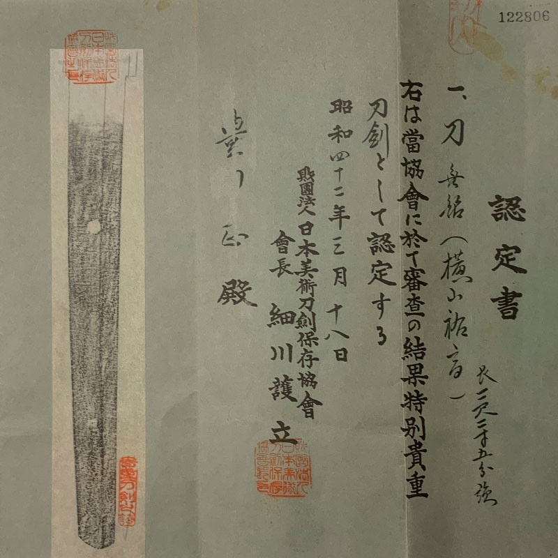 Dans une publication de la ‘Japanese Sword Society Of United States, Inc’ de 1977/1978. Suketaka aurait pour nom civil ‘Hisayama Mokuemon’, et est mentionné comme élève de Ise No kami Sukenaga (maitre de Sukekane). Sukenaga étant décédé en 1951, on peut supposer que Suketaka commença l’apprentissage de la forge avec lui et devint ensuite élève de Sukekane. The blacksmiths of Bizen produced many sabres during the Muromachi period, and particularly during the Sengoku Jidai period. The demand for weapons was then very strong among the powerful feudal lords. However, the tradition of sword-forging in the province of Bizen almost disappeared due to the devastating flood of the Yoshii River (1591), which hit the school of Osafune hard. Despite this destruction, some blacksmiths survived. Among them was a group of blacksmiths signing the name Sukesada. The main representative of this school was Yokoyama Fujishiro Sukesada, fourth master of the Sukesada school. One of his sons was Shichibei no Jyo Sukesada (七兵衛尉祐定). They were among the pioneers who revived the art of sword-forging in the province of Bizen. Suketaka was a descendant of this Sukesada. Suketaka began making sabres just before the ban on wearing the sword, the Hatorei 廃刀令 in 1876. The demand for sabres was then in very strong decline and the blades of this time are rather rare. He is considered the last blacksmith of the ancient lineage Bizen Osafune Yokoyama. This is a very beautiful blade, a perfect example of the high-end productions of the blacksmiths of Bizen.
