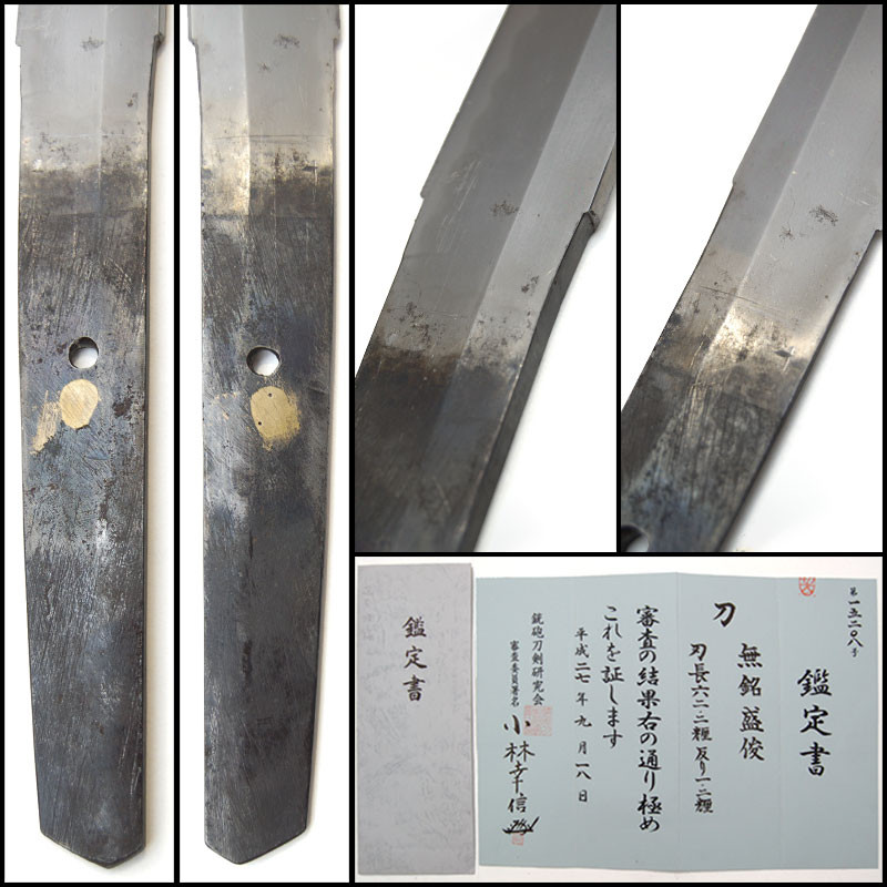 | Nakago | Ubu (unaltered) - Mumei (unsigned), 2 Mekugi Ana, 1 is brass covered. Shape: Ichimonji Gata /Futsu Gata. Ended in Iri Yama Gata Jiri (Dissymetrical V), Yasurime Ō Sujikai & Gyaku Ō Sujikai |