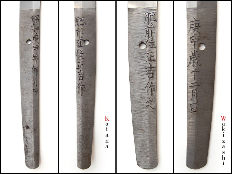 | Nakago | Signed Ura : 肥前國住正吉作 Omote : 昭和庚申年卯月日 Ubu (unaltered), 1 Mekugi Ana, Classical shape Futsu Gata, End in dissymetrical U (Ha agari Kurijiri), horizontal Yasurime |