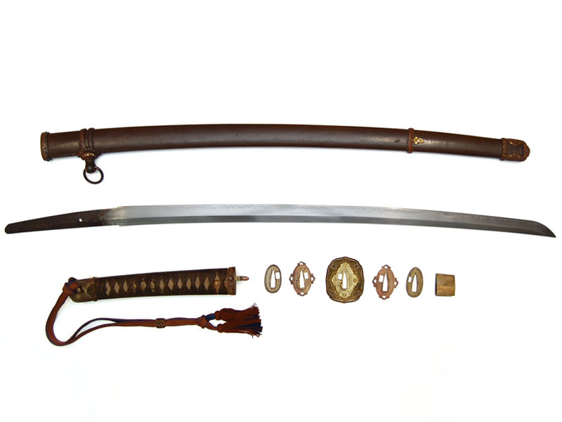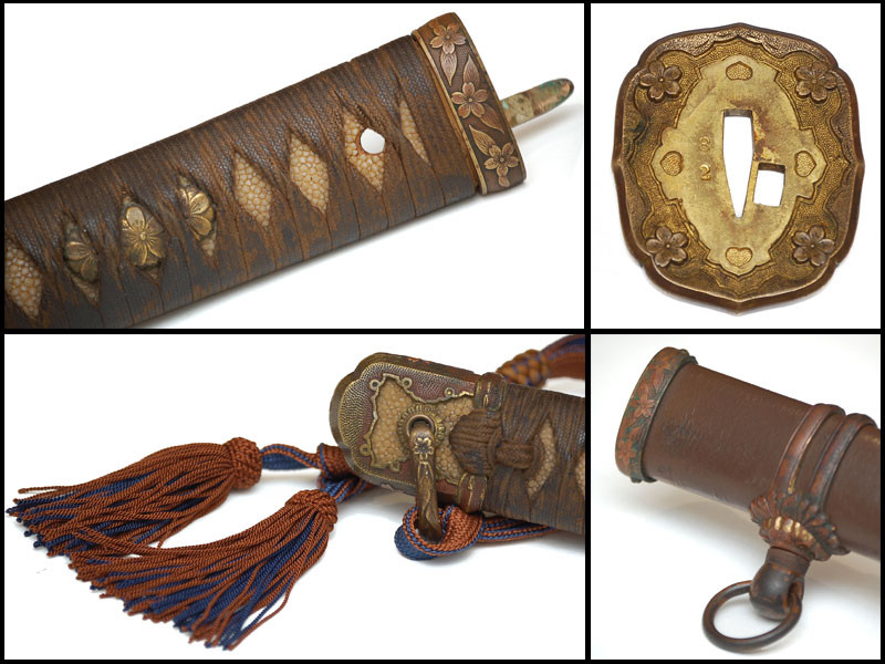 - Tsuka : 182g, 25.5cm (with Kabutogane), Moro hineri maki braiding in brown silk, white same. - Seppa : Double Seppa mounting numbered ‘82’.2 serrated seppa (13g) in gilded copper, 2 Seppa quadrilobed (18g) with Inome drawing (wild boar eye). The Inome drawing is also called Aoi Ha (Aoi leaves), it shows Asarum Ginger leaves, emblem of the Tokugawa Clan. - Habaki :25g, in copper, with vertical fine and little deep lines. - Fuchi Kashira :Fuchi numbered ‘82’ with Sakura flowers and leaves design, with Saya locking mechanism, push-button with a Sakura flower design. Kabutogane type Kashira, with Sakura flowers and leaves design, with an eyelet (Hatome) for the wrist strap. - Tsuba :125 g,5.83 cm x 7.01cm x 0.5 cm,numbered ‘82’, with 4 embossed Sakura on each surface, and embossed Seppa-Dai wo the shape of the quadrilobed Seppa. Rims in Sukidashi, Aoi Gata shaped (quadrilobed in the shape of Ginger Asarum leaves). - Menuki :2 Menuki yellow copper with three 10 petals Sakura flowers design. - Wrist strap: bicolored silk, brown and blue. This kind of wrist-strap was designed for senior officers, Lieutenants or Captains. |