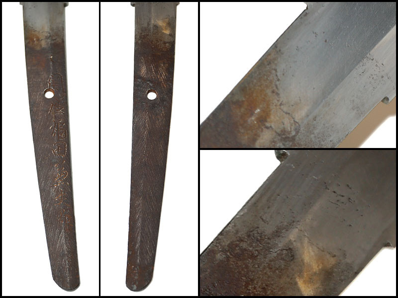 | Nakago | Ubu, 1 Mekugi Ana, “Ichimonji Gata” shape (Futsu Gata), ending in 'Ha Agari Kuriji' (Sissymetrical U), Yasurime ‘Taka No Ha’ (falcon feather, in chevrons). Signed Omote Mei : 関住福田兼丈作 “Sekiju Fukuda Kanetake Saku” |