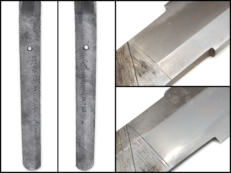 | Nakago | Longueur 22cm, Ubu (unaltered), signed Omote Settsu Koku Ju Nin Hidehisa Saku - 摂津国住人秀久作, dated Ura 平成三年二月日 - Heisei 3 Nen 2 Gatsu Hi (Feburary 1991), 1 Mekugi Ana. Classic general shape (Futsugata), end in dissymetrical U (Ha Agari Kurijiri), Yasurime Kesho. |