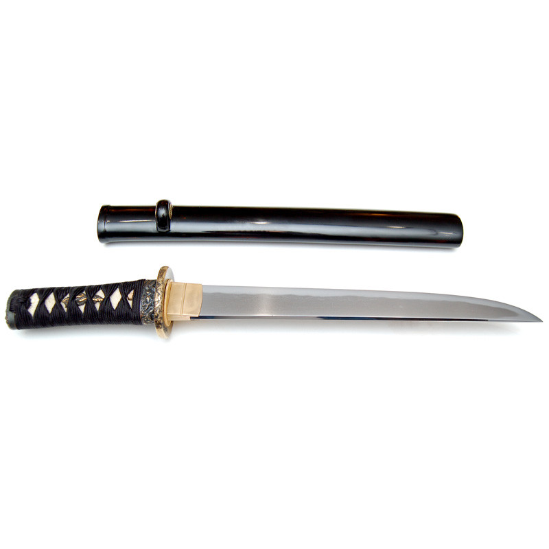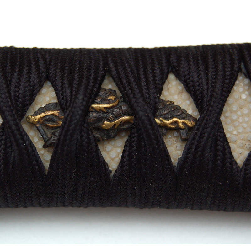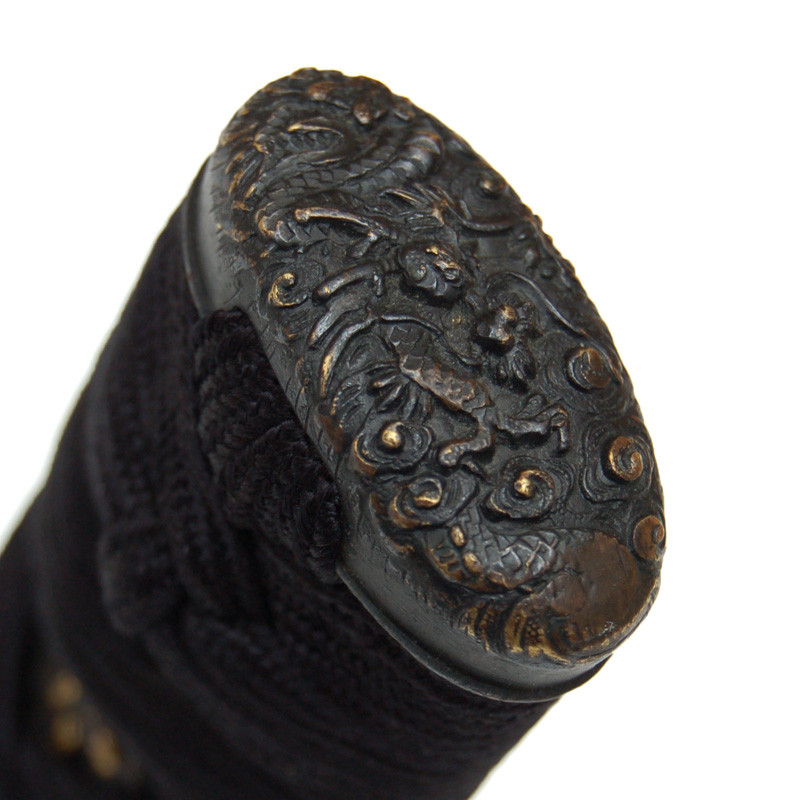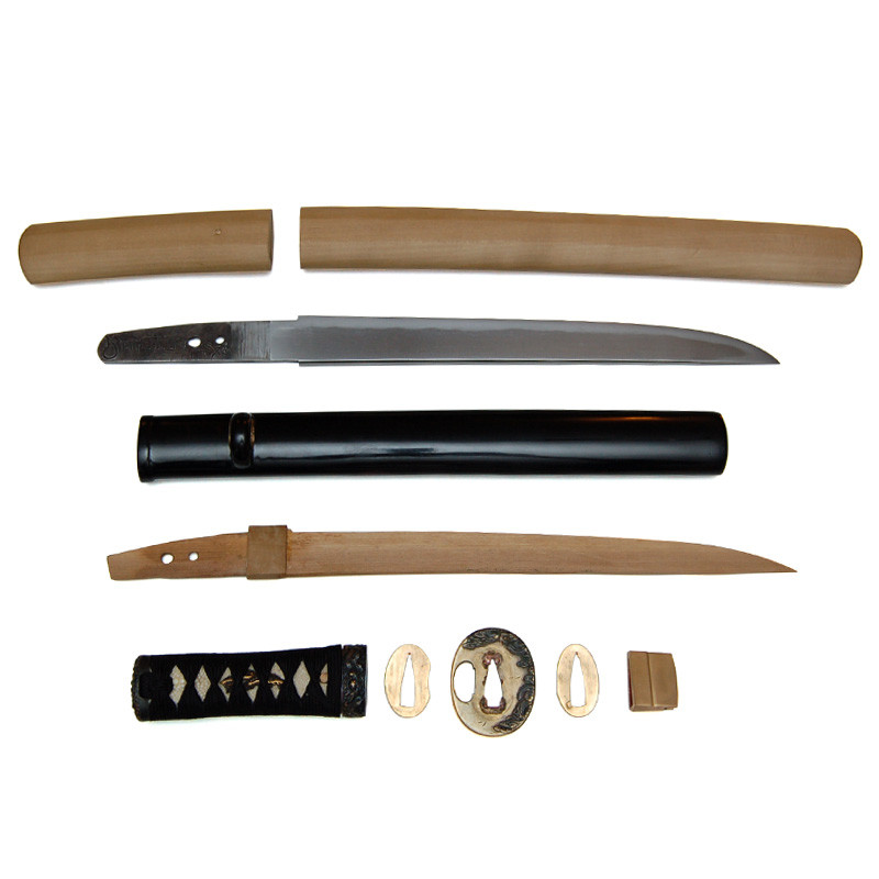 - Tsuba: Weight 77g, Size 4.68 x 5.9 x 0.45cm, in Sentoku, with a design of dragon in the cloudes (Unryu - 雲龍). - Habaki: Weight 27g, Size 2.59 x 3.25 x 1.05cm. In gilded copper. - Seppa: 2 Seppa (total weight 18g) serrated seppa in brass. - Shirasaya: Total weight 151g, Tsuka 46g/ 15.2cm, Says 89g/34cm, Tsunagi 17g/38.8cm. |
