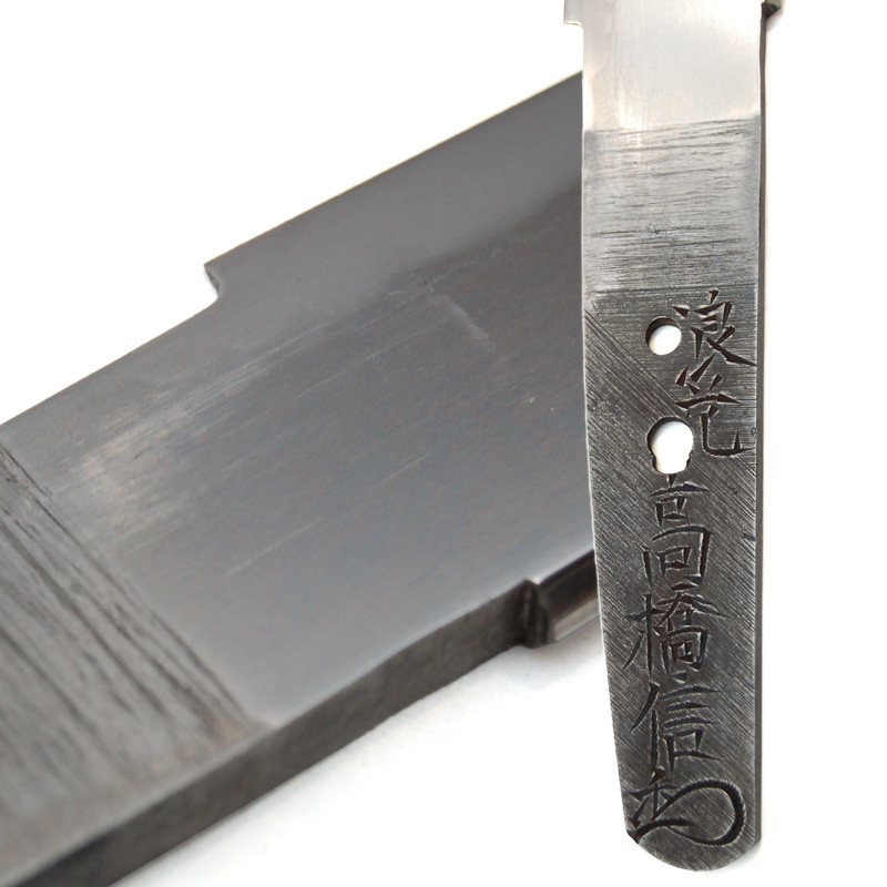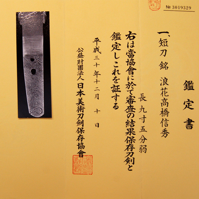 | Nakago | Length 12cm, signed on the Omote side "Naniwa Takahashi Nobuhide" 浪花高橋信秀, 2 Mekugi Ana placed in Ikken (一献). Classical shape Futsu Gata, slightly bulged. Nakago Jiri in Kurijiri (rouded), Yasurime O sujikai (diagonal file marks), with a start in Kiri Yasurime (horizaontal). | |