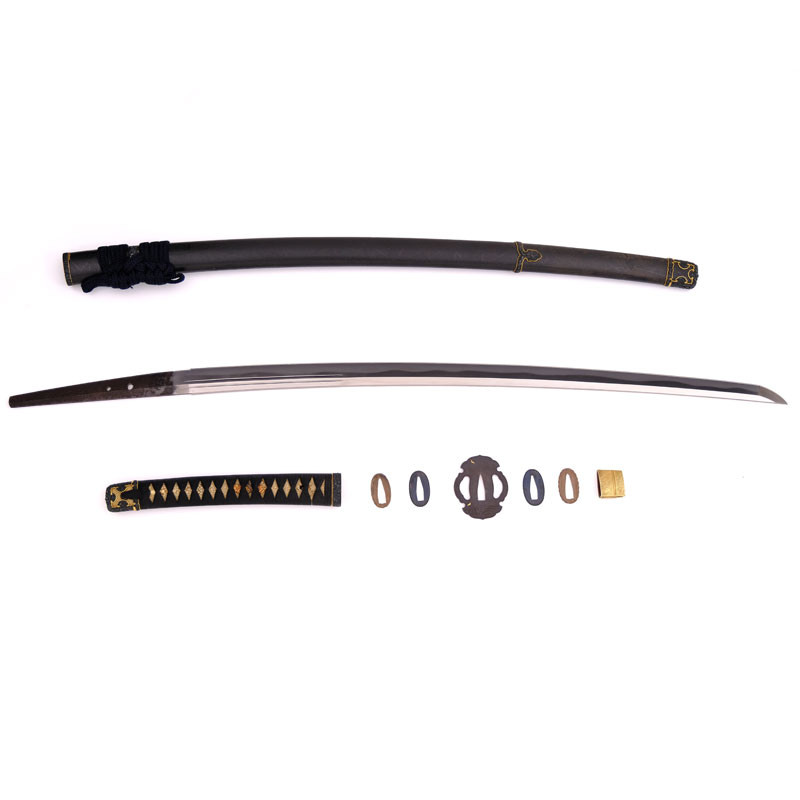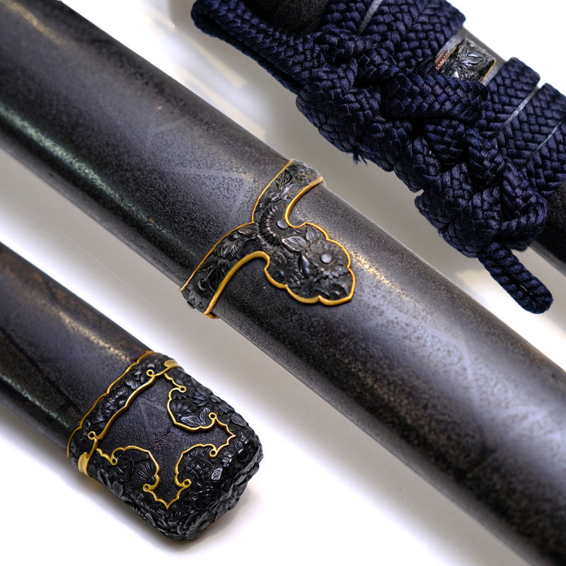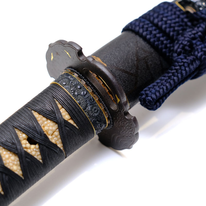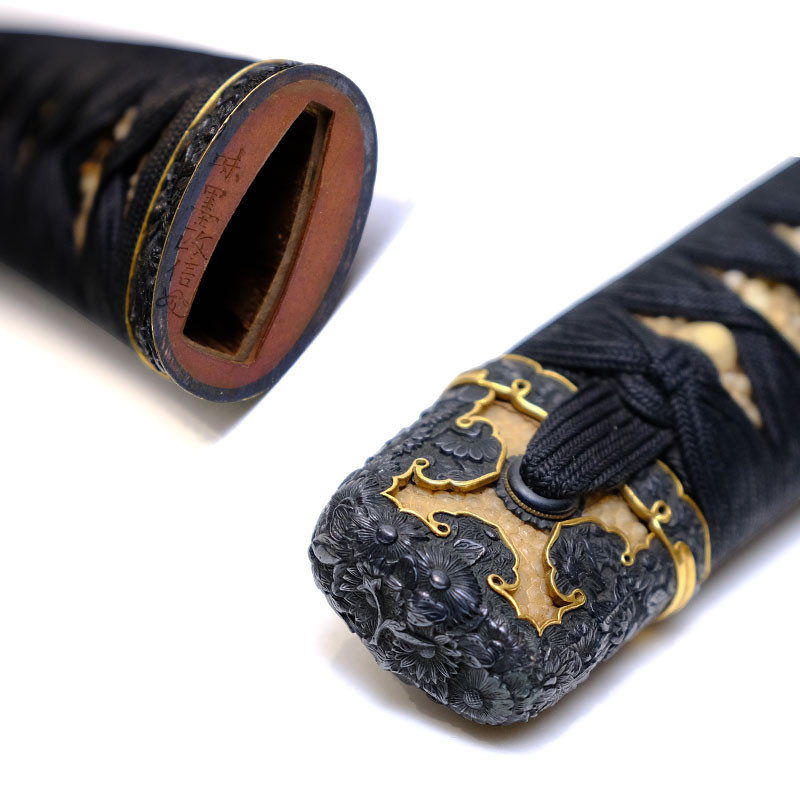 | Saya | Weight 218g, length 74.80cm, Saya lacquered black mast ishimeji-nuri type with geometric patterns, Sageo in dark blue silk, Handachi assembly in suite with the presence of Ishizuki, ShibaBiki, Kurigata and Koiguchi in Shakudo with Chrysanthemum motifs. Set of pieces signed and made by 味墨政信 (花押) Miboku Masanobu. | |