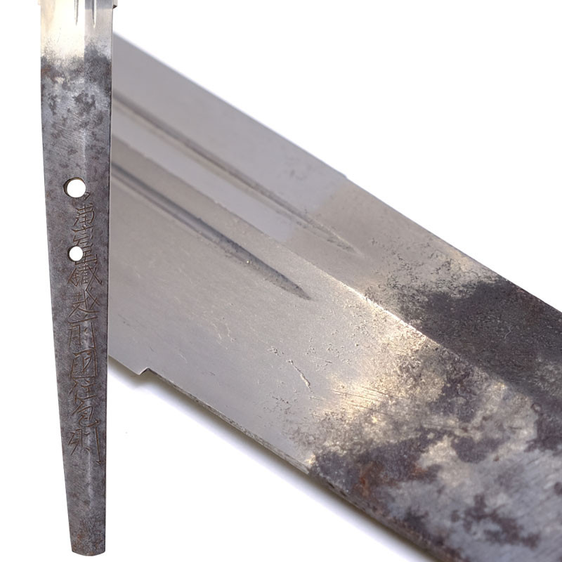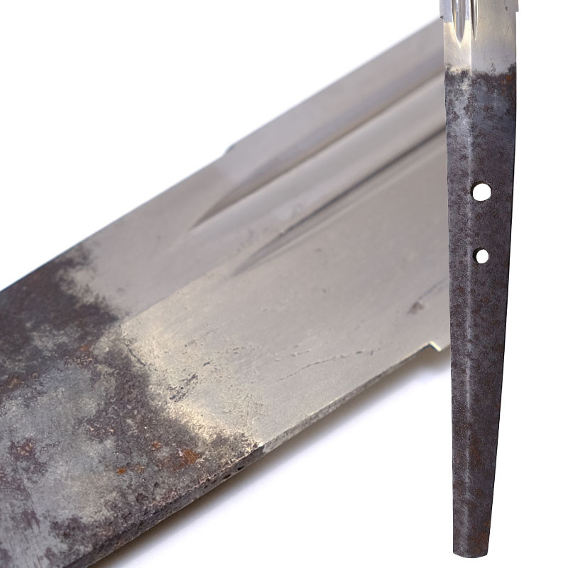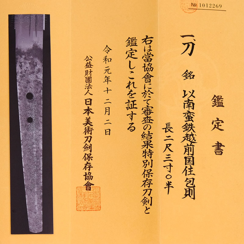 | Nakago | Ubu, signed on the Omote side 以南蛮鉄越前住包則 «Motte Nanban Tetsu Echizen Ju Kanenori», 2 Mekugi Ana, classical form Futsu Gata, Yasurime obliques Sujikai, rounded end Kuri Jiri. | |