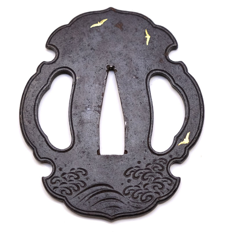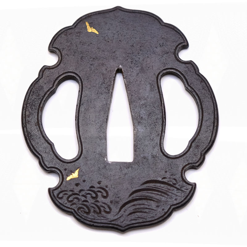 - Tsuka: Weight 127g, length 26.4cm, High-end Jabara Ito braiding in black silk, Same whole high-quality white, Menuki finely chiseled and gilded with chrysanthemum leaves and flowers, Fuchi and Kabuto Gane in suite with Handachi montage in Shakudo with patterns of leaves and chrysanthemum flowers. Set of pieces signed and made by 味墨政信(花押) Miboku Masanobu. - Tsuba: Weight 77g, dimensions 7.51 x 6.29 x 0.39 cm, Shitogi Gata shaped tsuba, in black patinated steel, with the motifs of «Nami Chidori» («Thousand birds on the waves») symbol of resistance and triumph in the face of adversity. -Habaki: 29g, Habaki in gilded copper, Shonai type with oblique Neko Gaki - Seppa : 2 Classic Crenellated Seppa (2x6g) and 2 Thick Seppa with Niche Borders (2x6.5g). |