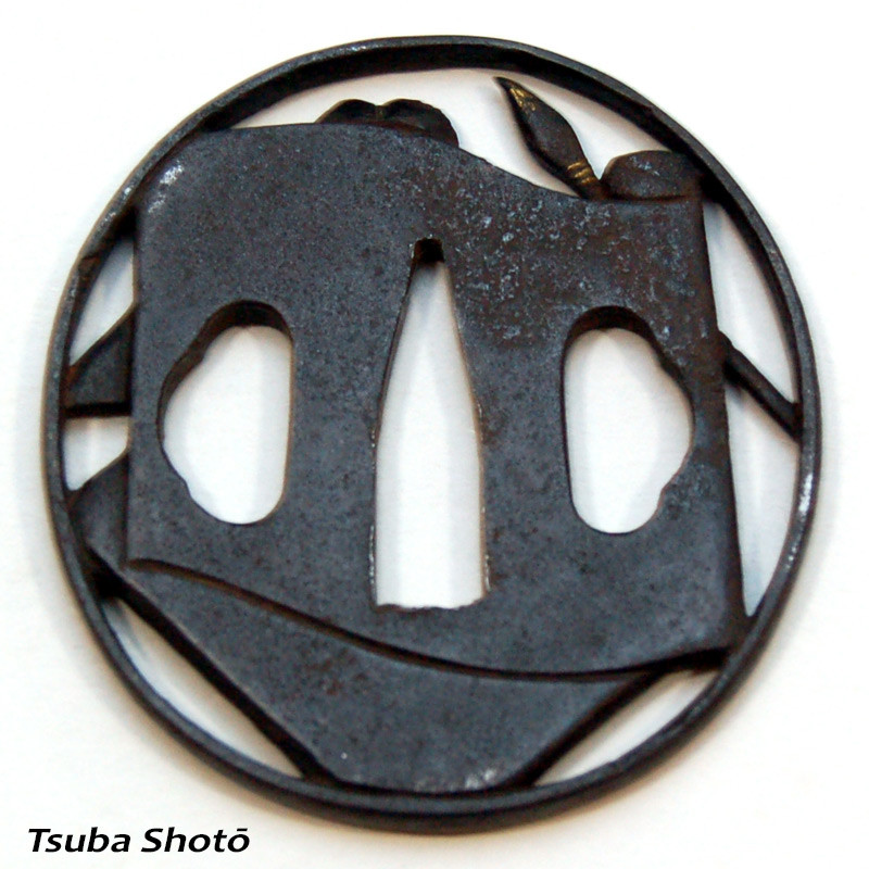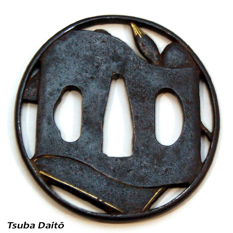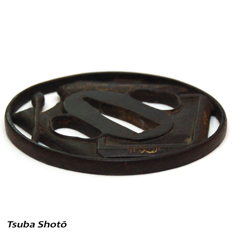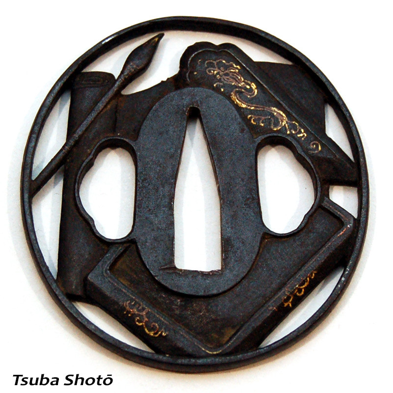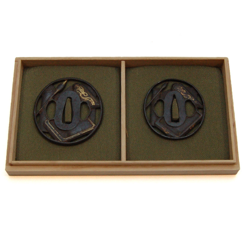 | Description | Description: Tsuba Set for Daisho in Iron, Maru-Gata (round), Ko Sukashi Bori (partial openwork), with Bunbōshihō (brush, paper, ink, ink stone) decoration. Gold inlays with the Nunomezogan (damascening) technique. Special Features: The 4 Treasures of Literature, the Bunbōshihō are 4: Brush (筆 fude), paper (和 紙 washi), ink (墨 sumi), and ink stone (硯 suzuri). They express the search for excellence in the arts of calligraphy, very difficult to master. Often such people were versed in poetry, literature and more generally in the arts of letters. This decor refers to Bunburyōdō’s maxim 文 武 両 道: the arts of letters Bun (文) and the arts of war (武), the two (両) ways (道). This maxim was promoted under the Shogunate Tokugawa, to push the Samurai to excel in both ways of literature and war equally thoroughly, with the aim of helping (or keeping them busy), from the era of warring kingdoms to an era of peace. |
