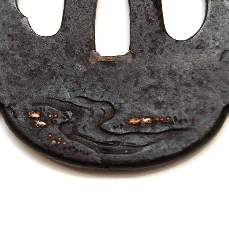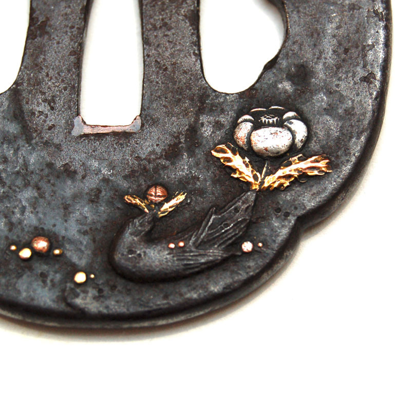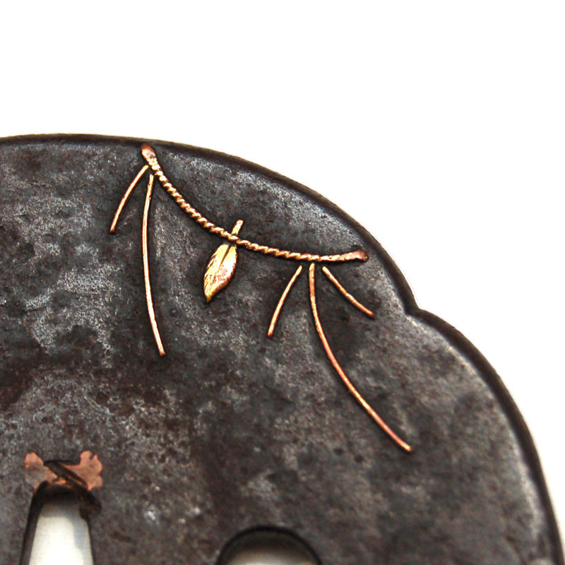 Description:Iron Tsuba, shaped Mokko-Gata (quadrilobed), grainy Tekkotsu, decorated in Omote with Japanese New Year decorations, a Shime Nawa, a bunch of rice and a peony, and in Ura a river. Partial inlays in brass, copper and silver with the Iroe Zogan technique.