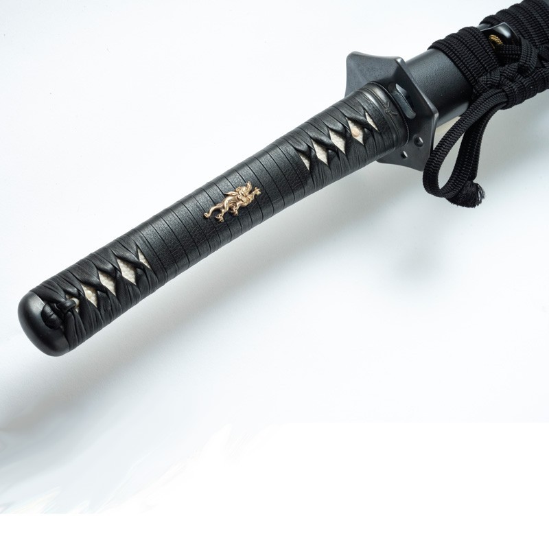 Tsuka Ito: Katate Hira Maki braiding of the Black Beef Leather handle, with Menuki centered apparent (specificity of this assembly).