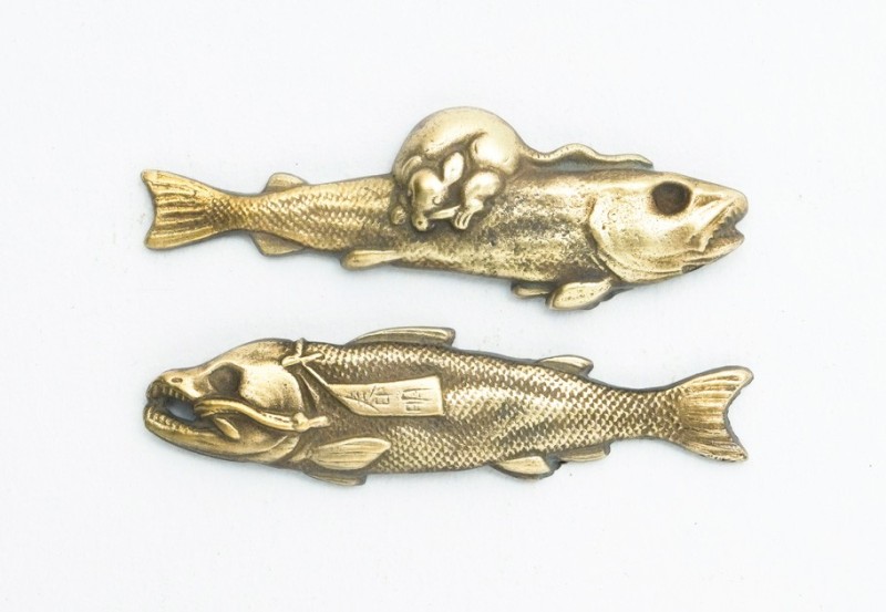 Menuki with dried salmon 鮭 motif, with a rat on one of the two Menuki.