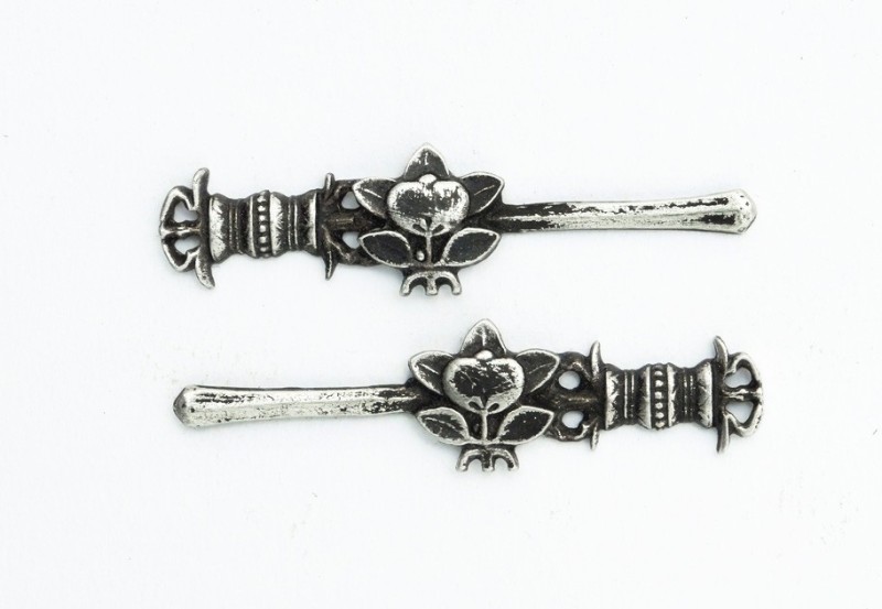 This menuki represents a flower of Mandarin tree crossed by a Sankozuka Ken 三鈷柄剣.