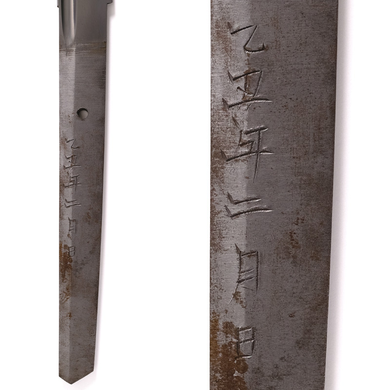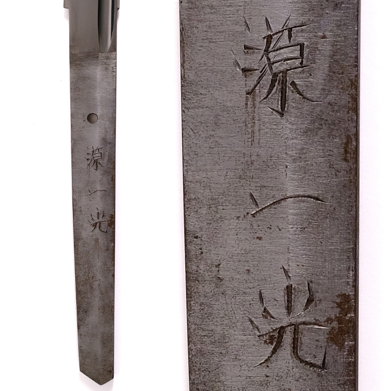 | Nakago | length 22.5cm, Signed 源一光 "Minamoto Kazumitsu" on Omote face and dated 乙丑年二月日 "1985" on Ura face, Futsugata Shape (Classic Shape), 1 Mekugi Ana, Kiri Yasurime, Iriyamagata End (Asymmetrical V-Shape) |