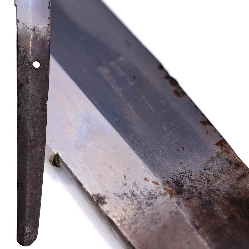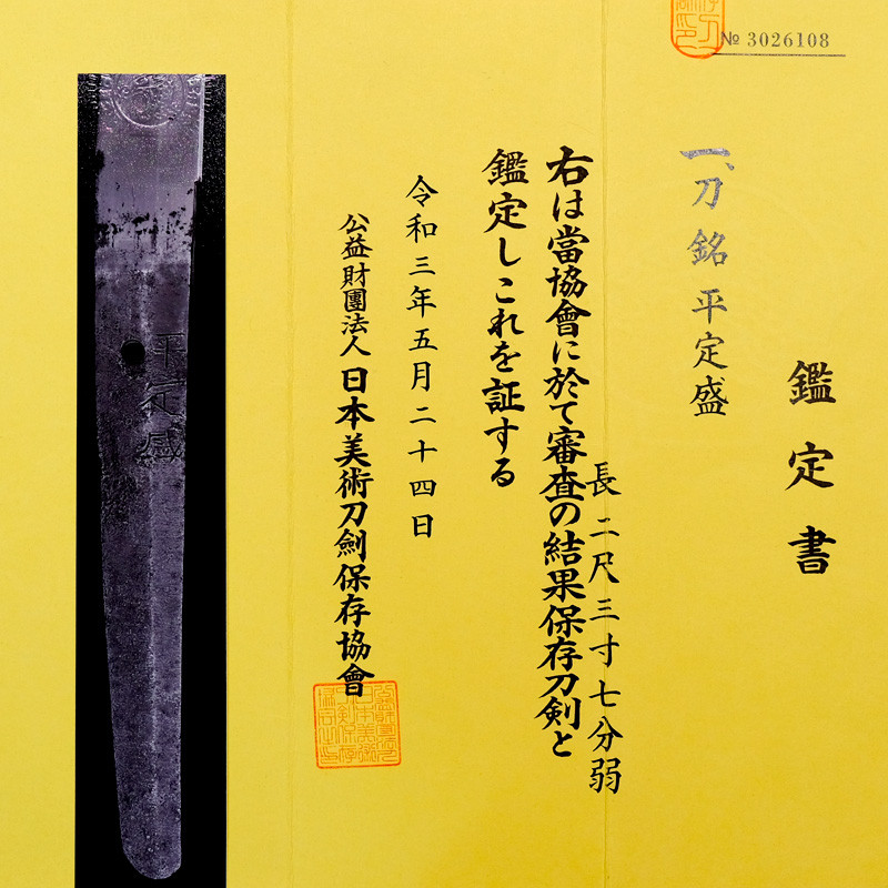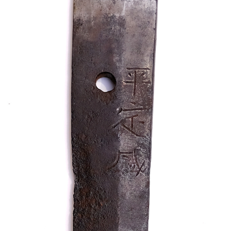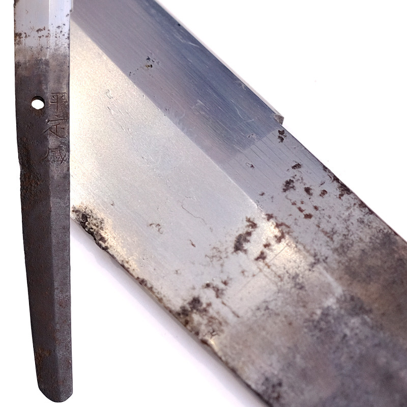 | Nakago | Ubu, Katana Mei signed Taira Sadamori on face Omote, 1 Mekugi Hana, Kiri Yasurime, Futsu Gata shape, Nakago Jiri Ha Agari Kurijiri (Disymetric U) | |