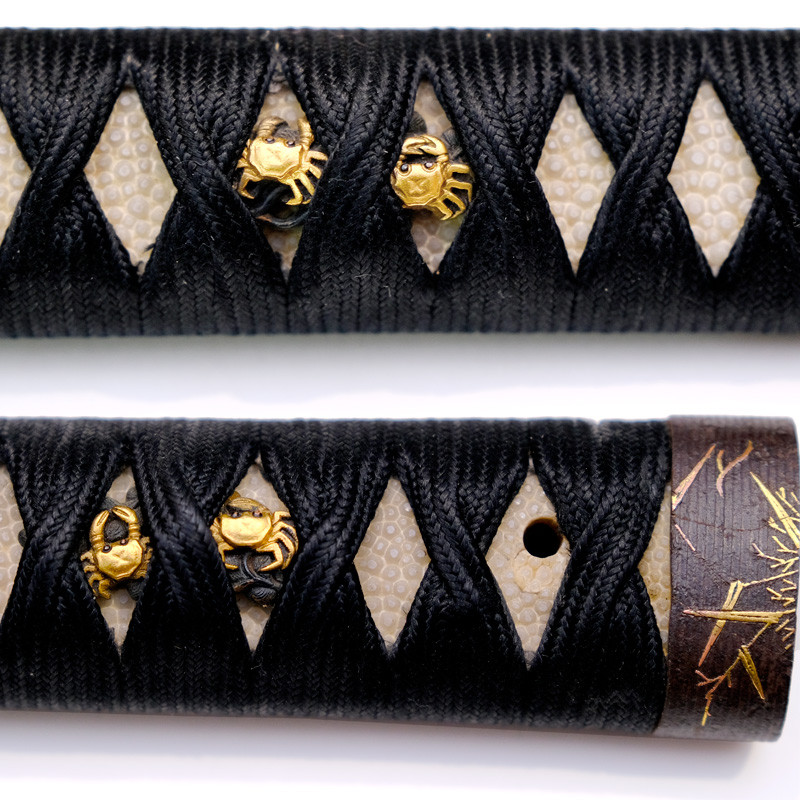 - Tsuka: 25.4 cm long for 108g. Same white, black silk Tsumami Maki braid. - Menuki : golden crab motif (symbol of the incarnation of the Taira or Heike warriors -according to the reading of the Kanji) - Tsuba : Maru Gata (round) rounded border Maru Mimi Gata. 1 Kozuka Hana Dimensions 7.87 x 7.75 x 0.32 cm for weight of 100g. in Sukashi opening Symbol of the Kuyomon, Mon of the Hosokawa clan of the Higo domain - Habaki: 31g Muji copper (unembossed) - Seppa: 2 copper crenelated seppa for a total weight of 8g |
