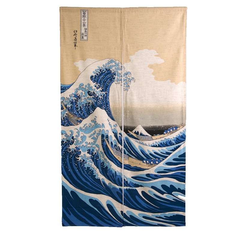 On this noren, is reproduced one of the most famous prints by Hokusai Katsushika, "Kanagawa-oki nami-ura" (神 奈 川 沖 浪 裏) or "The Great Kanagawa Wave" which is part of a series of prints entitled "Thirty-Six Views of Mount Fuji".