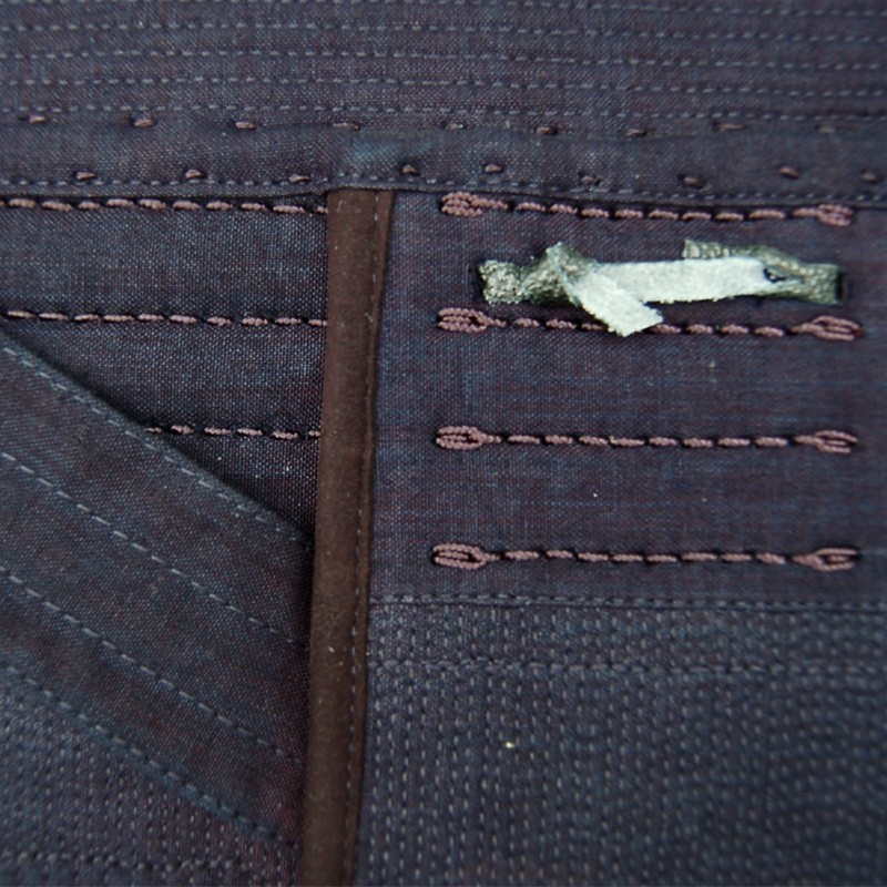 The measure, 5mm, represents the gap between the topstitching lines of the indigo cotton parts, the Sashi-Haba. The smaller the Sashi-Haba, the closer the lines are, the more durable and durable these parts are.