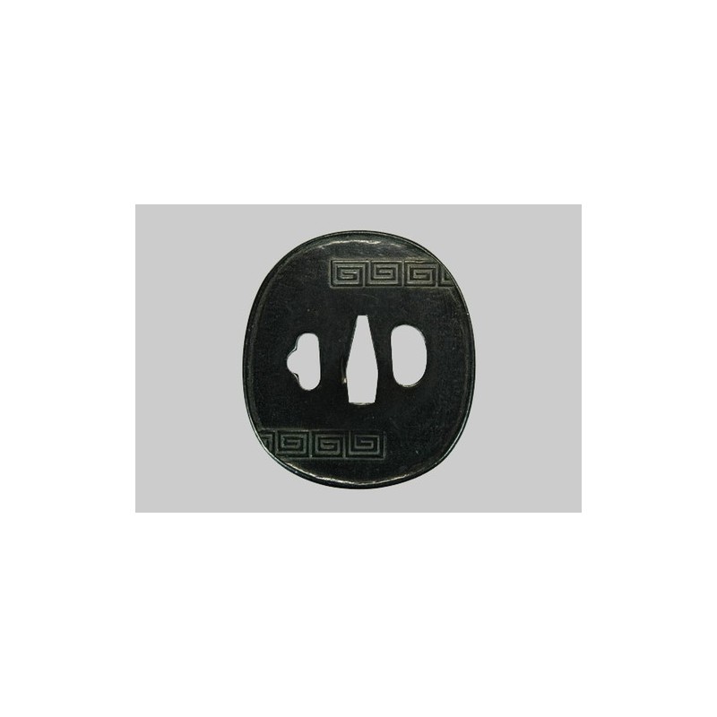 Sober tsuba, Naga Maru Gata (oval) shaped with horizontal edging in the shape of square spirals.