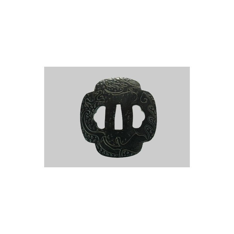 Tsuba Mokko Gata (quadrilobée), with Ame Ryu 雨龍 dragon in the rain motif on Omote face and a Vajra on Ura face, maru mimi border (rounded), presence of Kogai and Kozuka Ana.