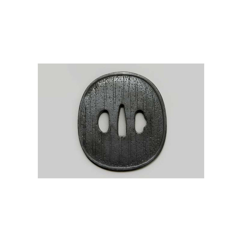 Tsuba shaped like Naga Maru Gata (oval), Sukidashi border (fenced), Fall rain design (Shigure 時雨), Kogai and Kozuka Ana presence.