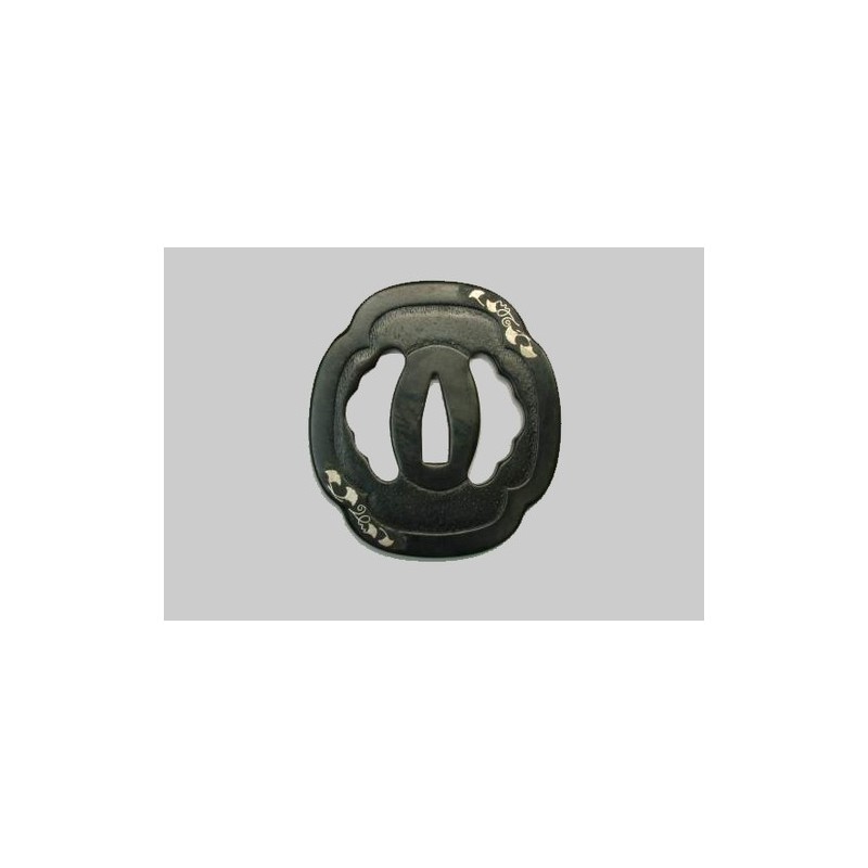 Mokko Gata (quadrilobate), Maru Mimi border (rounded), Kogai and Kozuka Ana in sukashi opening with pine motif.