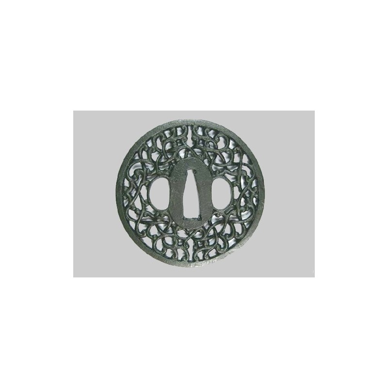 Tsuba shaped Maru Gata (Round), Karakusa Amime Arabesque Network design 唐 草 網 目, Kaku Mimi right border, with a Kozuka and Kogai Ana.