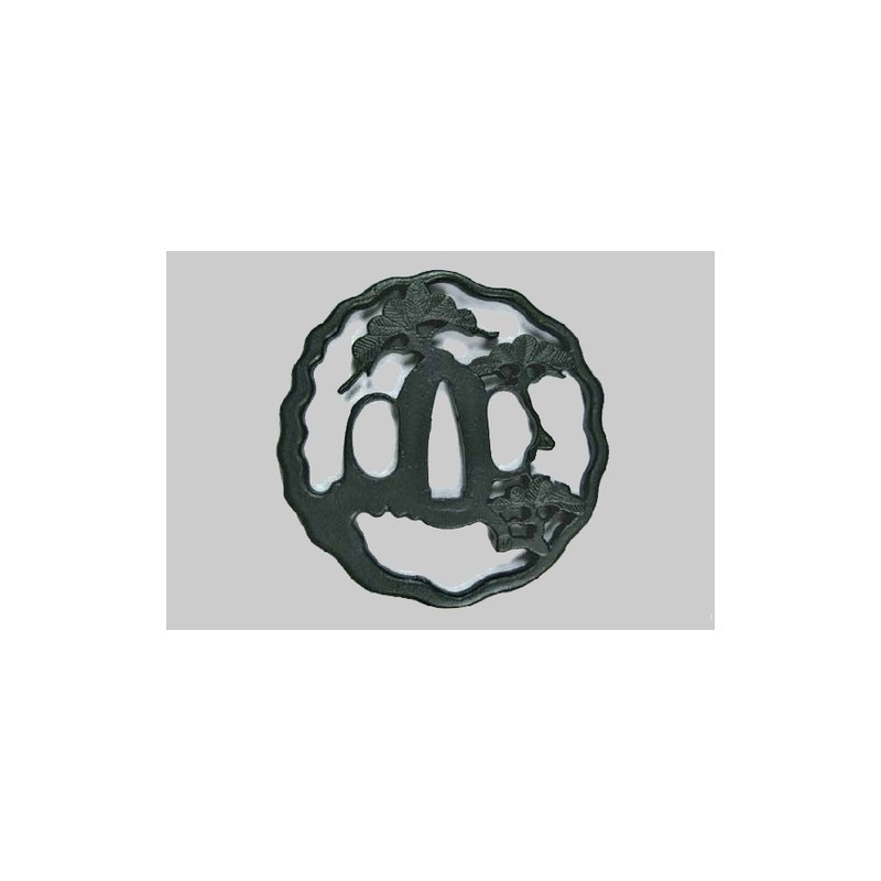 Tsuba Maru Gata (round) type, with the design of Matsu Sukashi 松 透 (Openwork pine), straight rounded border Maru Mimi, with a Kozuka and Kogai Ana.