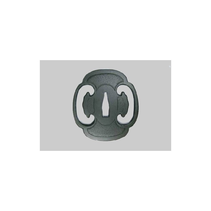 Mokko Gata (Quadrilobate) shape tsuba. Design by Higo Boke (肥後木瓜), rounded border Maru Mimi, with a Kozuka and Kogai Ana.