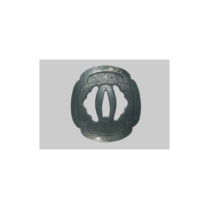 Mokko Gata (Quadrilobate) tsuba, design of Kasuga Karakusa (春日唐草), rounded border by Maru Mimi.
