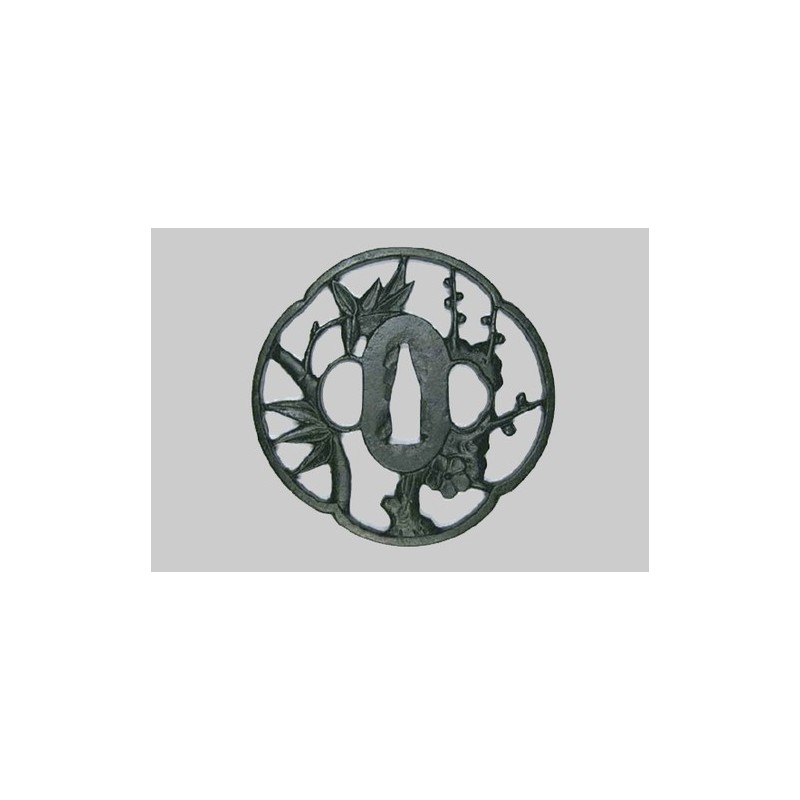 This Tsuba represents a plum (Ume - 梅) and bamboo (Take - 竹). This plant association, one of the most moving flowers and plants in Japan, is called "Saikan Niga" (歳寒二雅).