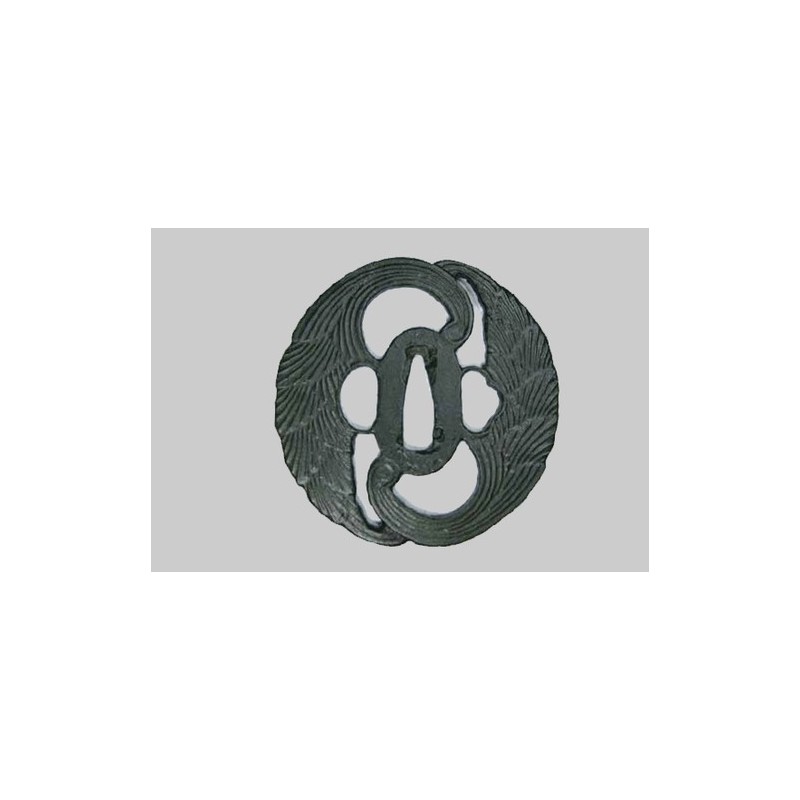 Tsuba Maru Gata round shape. Japanese ginger design (Myoga 茗荷), rounded border Maru Mimi, in Sukashi (openings).