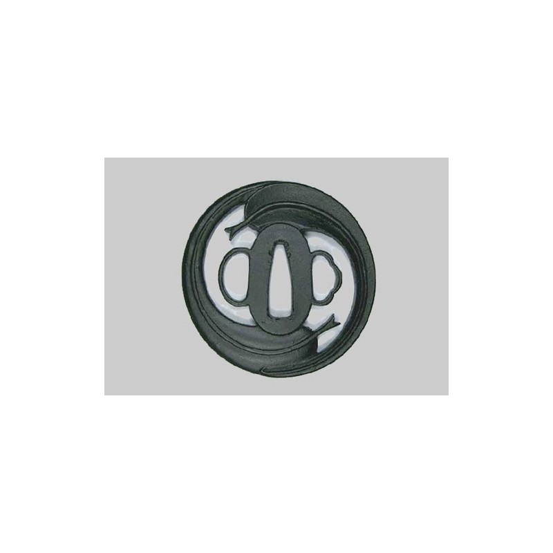 This Tsuba represents two leaves of Bamboo, the wings Hane (羽), in circle, Tomoe (巴). The bamboo, always green even in winter, growing quickly, is a symbol of resistance and perseverance. Under the snow, he gets grumpy and then he takes his superb as soon as the snow has melted.