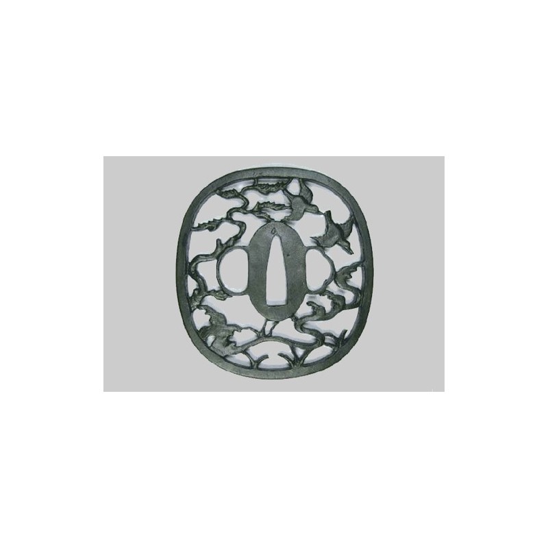 Naga Maru Gata tsuba (oval shape). Design of Gan (雁) a flock of wild geese in Sukashi, Sukidashi type fenced border, with a Kozuka and Kogai Ana.