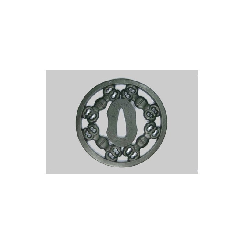 This Tsuba represents four Sankosho 三鈷杵, Buddhist Vajra handles with three 'claws' (trident) at each end. The small dots in the center of the handles represent demon eyes (鬼目). It is a ritual tool used in esoteric Buddhism, representing the indestructible law of Buddhism, and allowing to drive out demons.