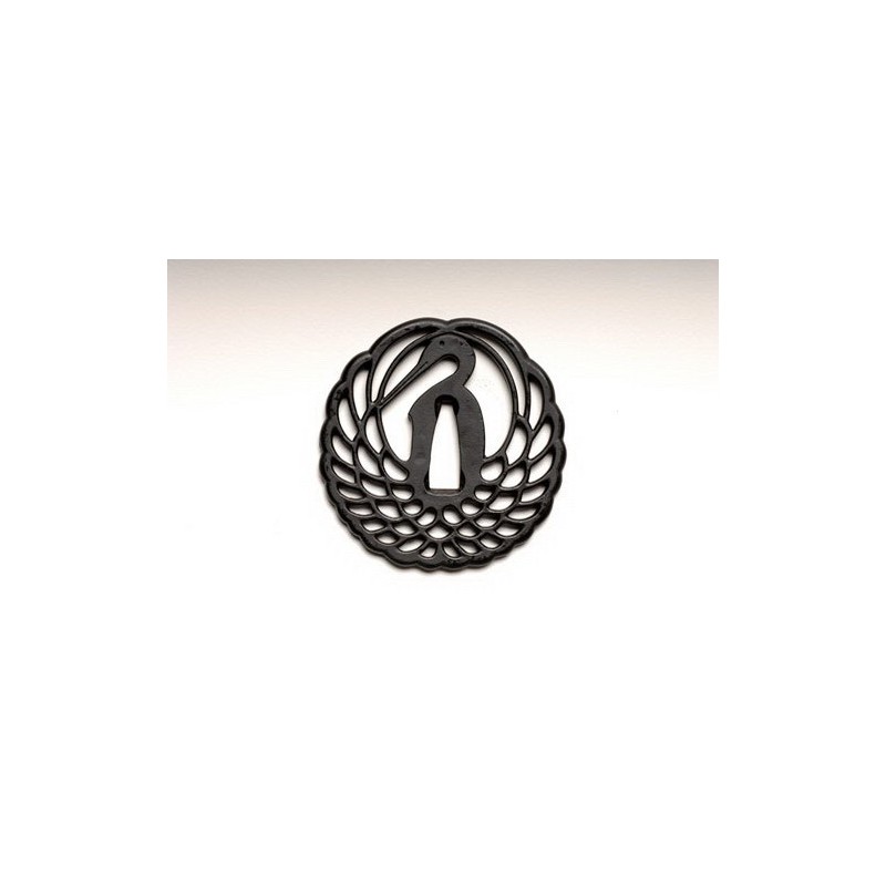 Tsuba in the form of a Kikku Gata (chrysanthemum). Design of Tsurumaru (鶴丸), with a crane spreading its wings in Sukashi, rounded border Maru Mimi.