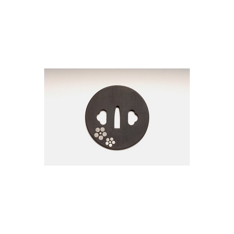 Tsuba in the form of Maru Gata (round shape). Design of Umebachi (梅鉢) 2 plums stylized in relief by inlay, rounded border Maru Mimi, with a Kozuka and Kogai Ana.