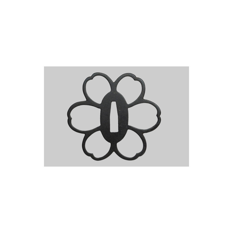 Kawari Gata (変 り 形, Irregular) shape tsuba. Design of Sakura Hana (桜 花, Cherry Blossom), in Sukashi (透), opening. Maru Mimi rounded edge.