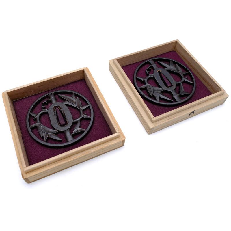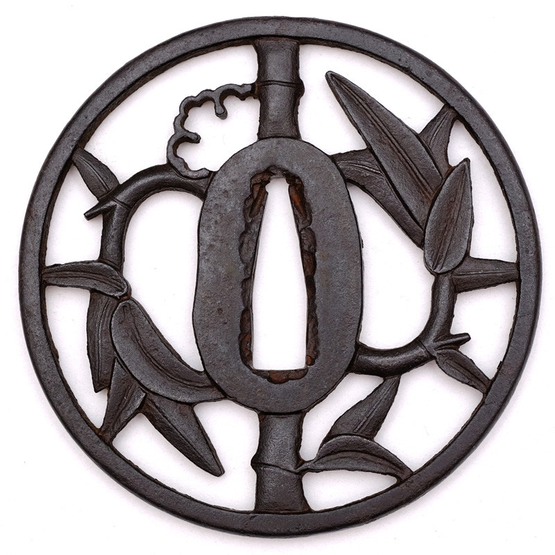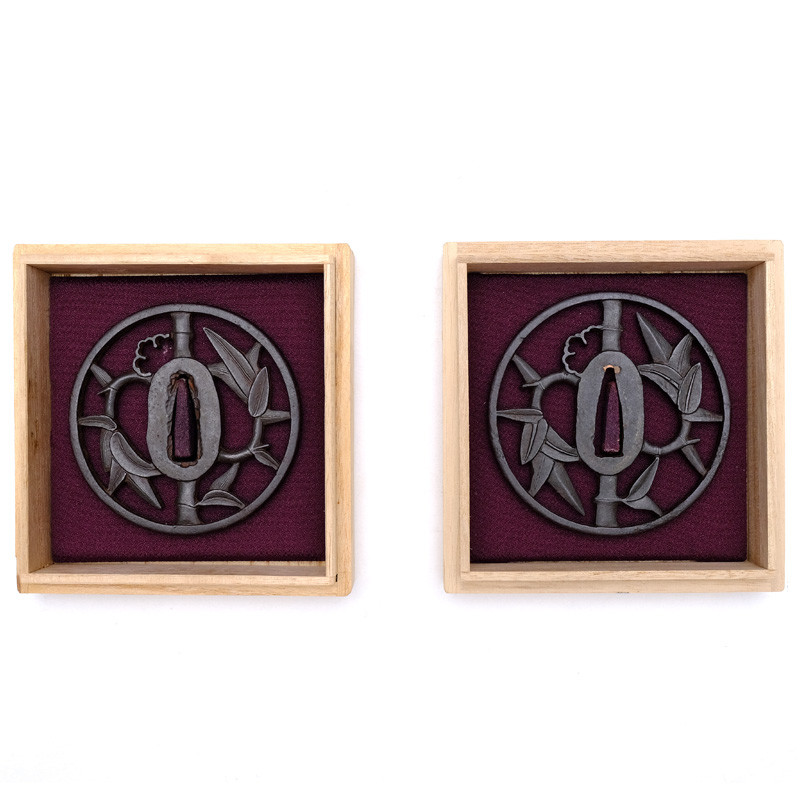 | Description | From Choshu, now Yamaguchi Prefecture, western Japan. Presence of Kozuka and Kogai Hitsu in the forms of Bamboos. Bamboo embossed patterns (trunks & leaves) in Sukashi techniques (openings). Maru Gata (Round) shapes, with flat Sukidashi edges. Patterns and typical Choshu school work. |