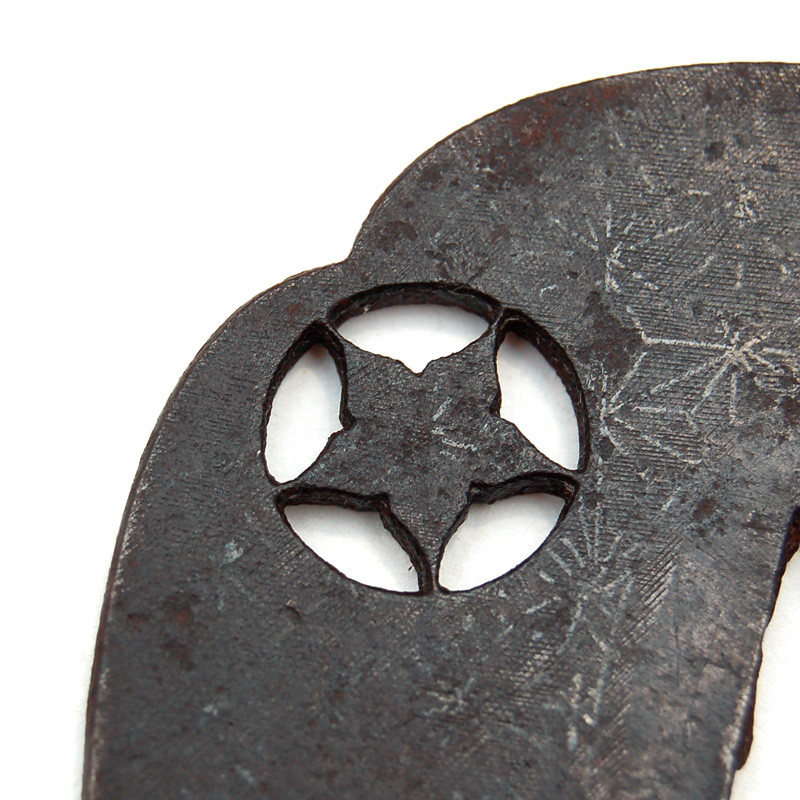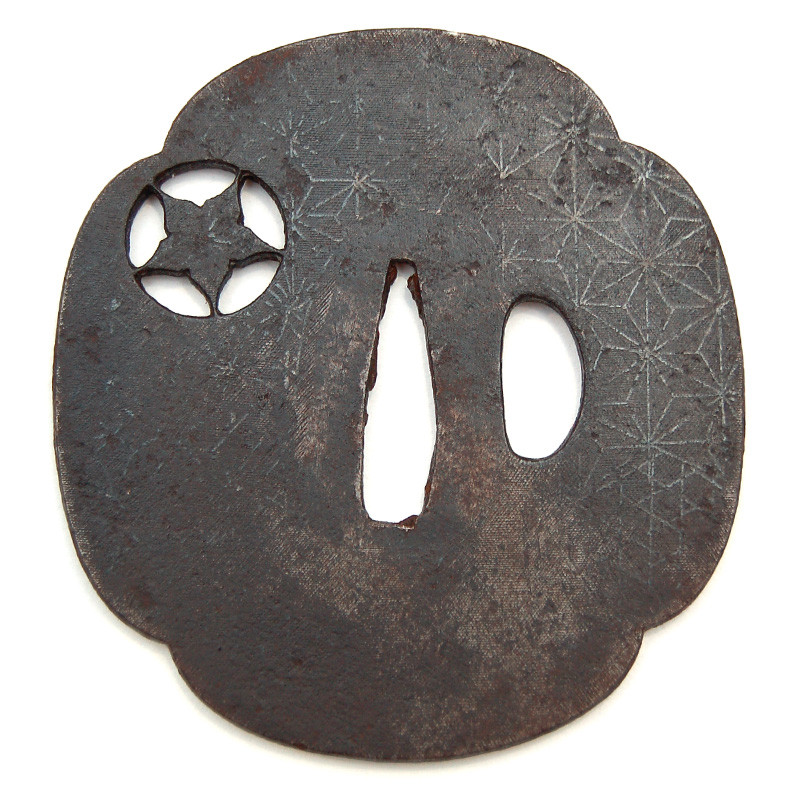 Description: Iron Tsuba, Mokko Gata shape (quadrilobed shape) with a cross hexagon design representing the linen leaf (Asanoha) with the Hira Zogan technique.