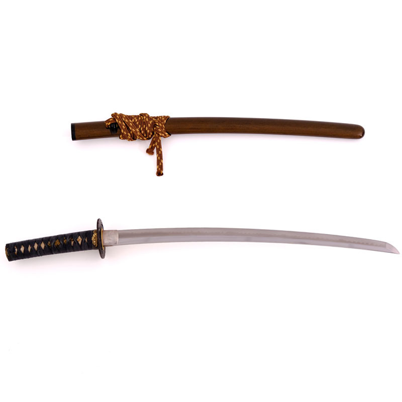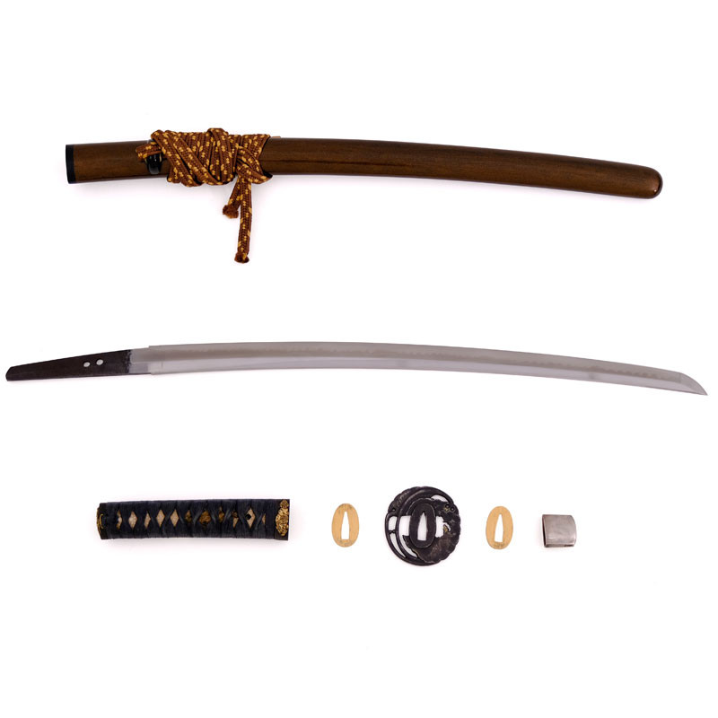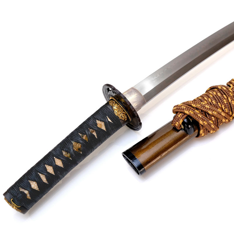 | Saya | Weight: 214g, Length 56.4 cm, glossy lacquer Golden brown, Sageo bicolored polyester Brown and golden, Koiguchi and Kurigata in horn with gilded Shitodome, Rounded Saya tip, space for Kogatana. | |