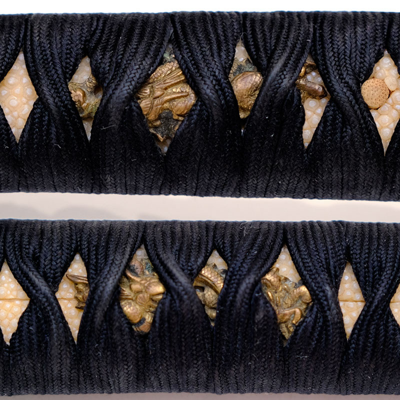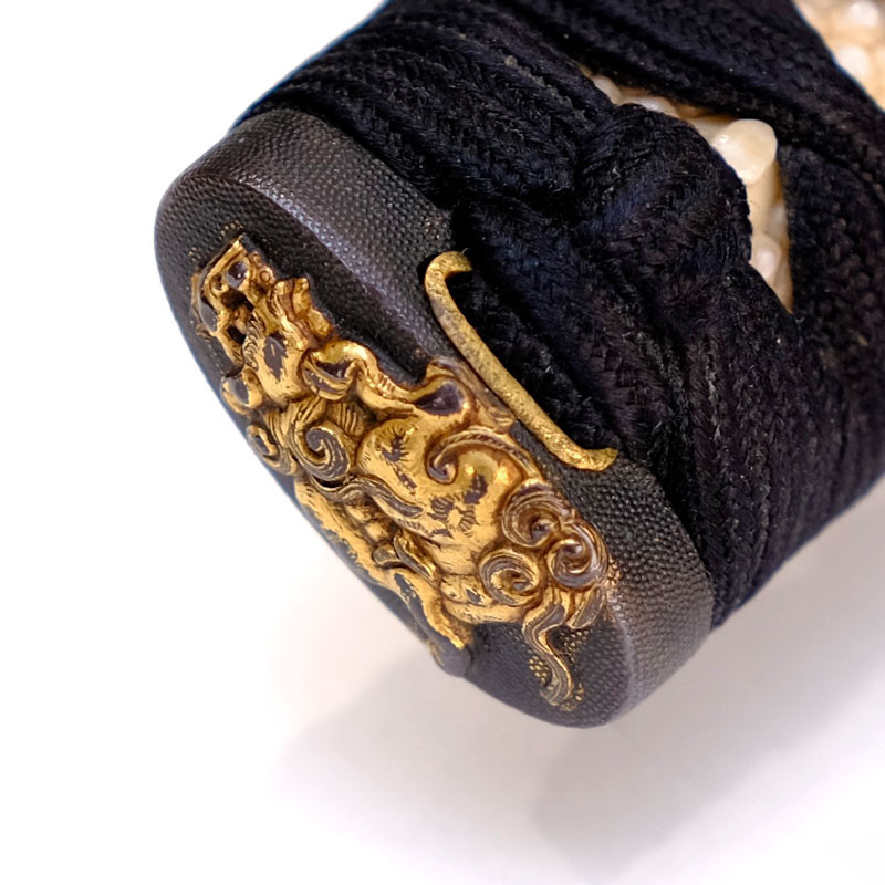 - Tsuka: Weight 107 g, Length 17.2 cm, Same White whole, Black silk Tsumami Maki braiding, Menuki in Sentaku, Dragon Pattern, Fuchi Kashira with golden Shishi (Komainu) patterns on a black patinated Nanako background. - Tsuba : Weight 101 g, Dimensions 7.02x7.41x0.47cm, Kawari Gata Shape (hugging the pattern), Leaf Pattern in Sukashi and Nikubori technique with traces of golden stripes, Typical Kinai school. - Habaki: Weight 30g, Copper covered with silver leaf, Unpatterned on sides (Muji), Nekogaki sur Mune and Ha. Seppa: 2 Seppa golden copper, fine rounded crenellation, total weight 10g. |