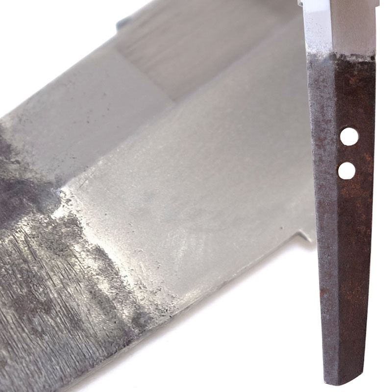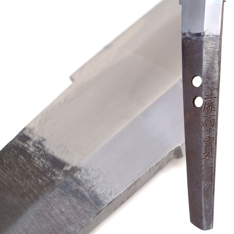 | Nakago | Ubu, signed on Omote ‘藤原實行’ Fujiwara Saneyuki, Length 13.5 cm, 2 mekugi Ana, Classic Futsu Gata shape, Yasurime Katte Sagari on the sides (very slightly inclined), Yasurime Sujikai on Mune and Ha (Inclined), Kuri Jiri tip in Iriyama Gata Jiri (V Asymmetric). | |